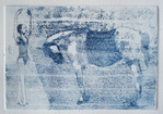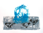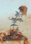 2016Ets van een roos in een glazen vaas. Het papier is geweekt in water met staalwol, de inkt waarmee de roos gedrukt is is blauw. Oplage van 30 etsen.