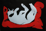 2015Witte en zwarte kat innig verstrengeld op rood kussen.